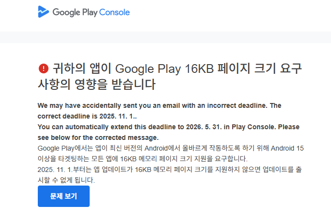 그런데 얼마 후 Google Play 16KB 페이지 크기 요구 라는 메일이 날라왔다.